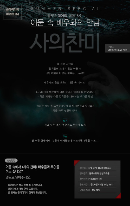 인터파크가 '어둠 속 배우와의 만남'이라는 제목으로 이색 행사를 연다.인터파크는 오는 27일 저녁 7시 뮤지컬 '사의 찬미', 8월 17일 저녁 8시 '여신님이 보고 계셔'의 배우들과 한남동 공연장 블루스퀘어 삼성카드홀에서 '어둠 속 배우와의 만남'을 진행한다.배우와 연출자를 직접 만나 공연 이해도와 관심을 높이기 위해 정기적으로 진행하는 인터파크의 '배우와의 만남' 행사를 납량 특집으로 꾸민 것. 이날 행사는 암전 속 공연장 투어와 이벤트, 배우와 대화 시간으로 구성되며, 불 꺼진 공연장의 로비와 객석 등 공연장 곳곳을 누비며 색다른 체험을 할 수 있다.참가자들은 5~6명씩 소그룹으로 나누어 블루스퀘어 하우스 매니저들이 한 팀씩 전담 안내하고, 정해진 동선을 따라 움직이고 공연장 곳곳을 둘러 본 후 배우들과 만나 이야기한다.암전 속에서 간단한 공연장 투어를 통해 평소 익숙한 공연장이라는 공간을 새롭게 인식하는 계기를 갖고, 얼굴이 보이지 않는 상태에서 배우와 대화를 통해 좀 더 솔직하고 심도 있는 이야기를 나눌 수 있는 기회를 마련하고자 기획됐다. 출연진 중 어떤 배우가 참석할지는 현장에서 (불이 켜진 후에나) 공개된다.'어둠 속 배우와의 만남' 참여방법은 인터파크 공연포털사이트인 플레이디비 이벤트 페이지에서 댓글로 신청하면 된다. 공연에 관심 있는 누구나 참여 가능하며, 공연 출연진 중 어떤 배우가 이날 행사에 참석할지는 공개되지 않는다.