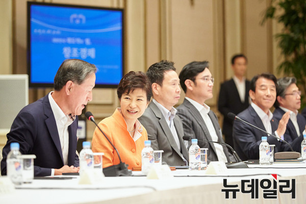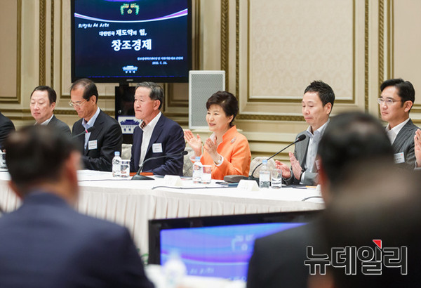 환한 미소로 대기업 총수를 맞이한 박근혜 대통령은 먼저 창조경제가 해외에서 호평을 받고 있다고 소개하며 "창조경제 기반을 충분히 활용하고 또 발전시켜서 본격적으로 성과를 창출해 내야 한다"고 말했다.