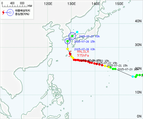 할롤라는 26일 밤 제주도 동쪽 해상까지 북상한 뒤 27일 새벽에는 영남지방을 비껴가 같은 날 오후 동해상에 서 열대저압부로 약화할 것으로 보고 있다.
