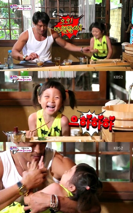 '추블리' 부녀가 소면 하나로 유쾌함이 넘치는 '먹방 데이트'를 펼쳤다.26일 방송된 KBS 2TV 예능프로그램 '슈퍼맨이 돌아왔다'에서 추성훈-추사랑 부녀가 소면을 먹으며 '폭풍 먹방'을 선보였다.이날 방송에서 추 부녀는 삶은 소면을 직접 헹구어 먹는 독특한 콘셉트의 식당을 찾아 갔다.이때 추성훈은 소면이 물살을 가르며 통과하는 구간 앞에 추사랑을 앉혀 놓고 소면 잡기 특별 훈련에 나섰다.추사랑은 빠르게 움직이는 소면으로 인해 어쩔 줄 몰라했고, 이어 추성훈과 자리를 바꿔 앉아 끊임없이 소면을 집어넣는 등 부녀는 행복한 모습을 보였다.