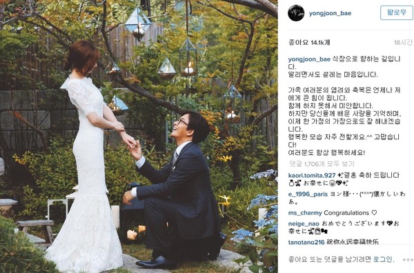 팬들에게 인사를 하지 못한 게 마음에 걸린 탓일까? 배용준은 잠시 후 자신의 인스타그램에 팬들을 향한 짧은 소감을 남겼다.식장으로 가는 길입니다. 떨리고 설레는 마음입니다.