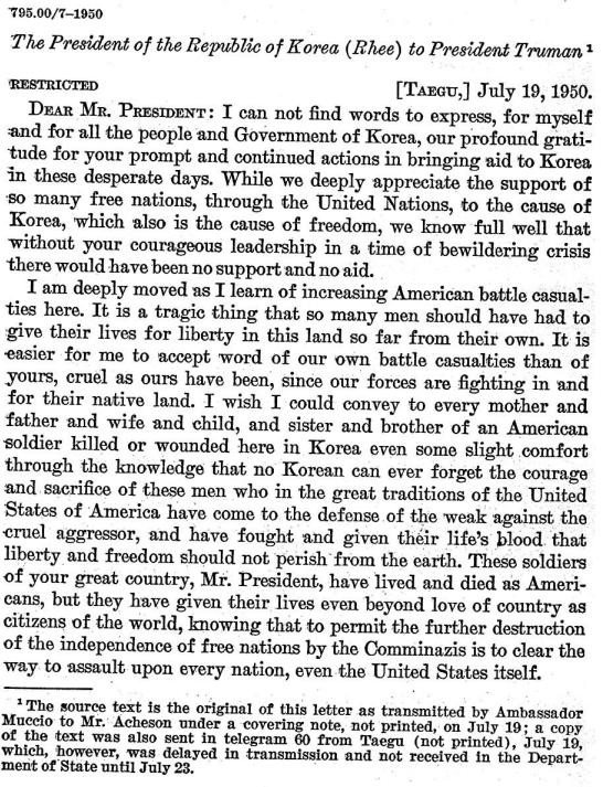 이 편지에서 李 대통령은 미군의 희생을 애도하는 감동적인 위로의 말을 전한 뒤