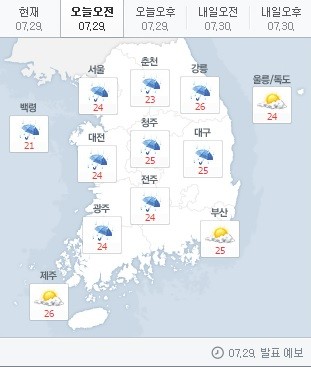 오늘 날씨는 서울을 비롯한 전국에 비가 내릴 것으로 예상된다.28일 기상청에 따르면 장마전선의 영향으로 이날 오후까지 비가 내릴 예정이다.예상 강수량은 서울, 경기도, 충청남도, 전라북도, 서해5도 20~60mm를 기록하겠다.그 밖의 중부지방, 남부지방(전라북도·제주도 제외)은 5~30mm가 예상된다.아침 날씨는 여전히 후덥지근한 날씨가 이어질 것으로 보이며 평년과 비교해 기온이 조금 더 높겠다. 오후 날씨는 비의 영향으로 평년보다 낮을 전망이다.아침 최저기온은 22도에서 25도가 되겠다.지역 별로 서울 24도,대전 24도,춘천 22도,대구 25도,광주 24도,부산 25도,제주 26도이다.낮 최고기온은 27도에서 35도가 될 것으로 예상된다.지역 별로는 서울 27도,대전 29도,춘천 28도,대구 33도,광주 31도,부산 31도,제주 32도를 나타내겠다.