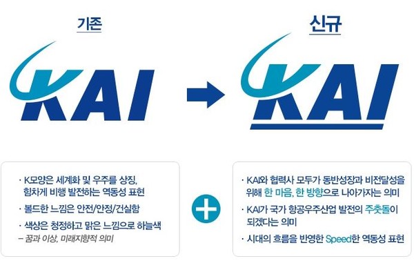KAI는 신규 CI에 우리나라 항공산업 대도약의 의지와 비전을 담았다. 임직원들의 의견을 반영하여, 기존 CI를 기반으로 ‘주춧돌’, ‘하나 됨’, ‘스피드’를 의미하는 도형을 디자인해 추가했다.