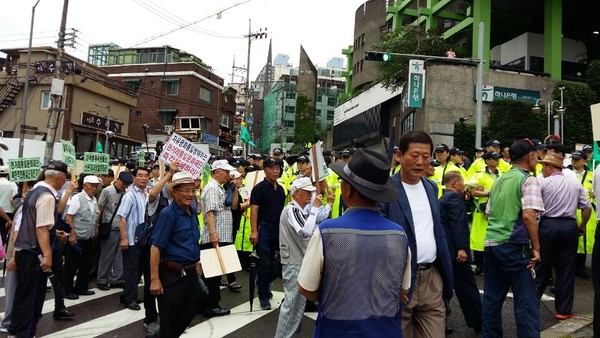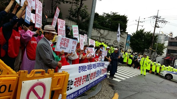 29일 오전 서울 마포구 공덕동 한겨레신문사 앞, 장마 비가 쏟아지는 날씨에도 대한민국어버이연합, 엄마부대봉사단, 청년지식인포럼 스토리 K 등 30여개의 애국시민보수단체, 500여 명의 회원들이 총집결했다.