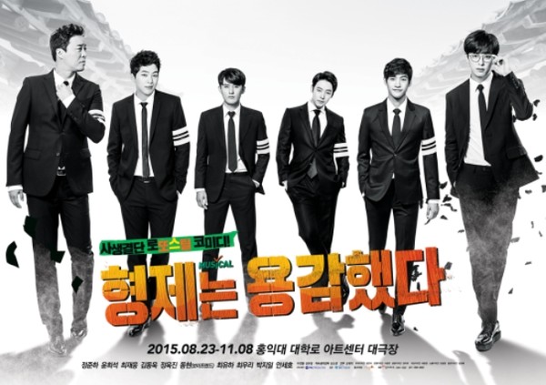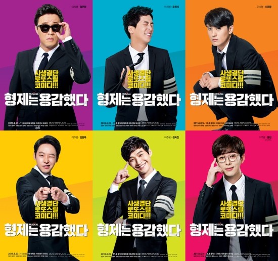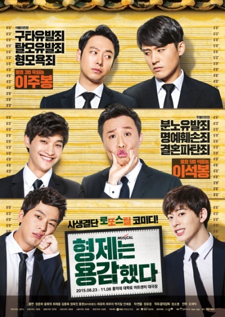 창작 뮤지컬 '형제는 용감했다'의 2종 메인 포스터와 개별 캐릭터 포스터가 공개됐다.범인 체포 직후에 찍는 식별용 사진(머그샷)을 연상시키는 메인 포스터는 불효 막심한 두 형제의 죄명을 재치있게 나열하며 배우들의 다양한 표정과 위트 넘치는 카피로 주인공 석봉과 주봉, 두 형제의 캐릭터를 유쾌하게 표현했다.또, 공연의 내용과 배경을 짐작케 하는 의상과 신선한 디자인으로 감동적이면서도 화끈한 재미를 선사할 것을 예고하며 공연에 대한 기대감을 높이고 있다.메인 포스터와 상반된 느낌의 서브 포스터는 배우들의 멋진 포즈와 진지한 표정으로 인물의 복합적인 감정을 함축적으로 표현해 앞으로 공연에서 펼쳐질 두 형제의 파란만장한 스토리를 예고한다.