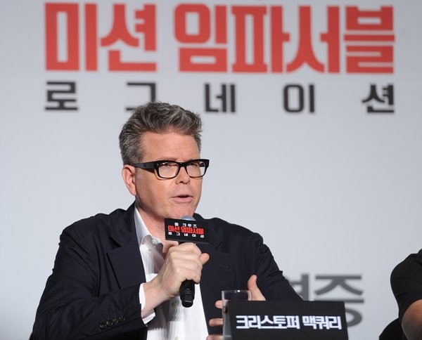 30일 오전 서울 삼성동 그랜드인터컨티넨탈 서울 파르나스 호텔에서 열린 <미션 임파서블 : 로그네이션> 내한 기자회견에 참석한 맥쿼리 감독은 "좋은 장면을 관객에게 선보이기 위해 톰 크루즈를 비롯한 연기자들이 위험한 액션 촬영을 마다하지 않았다"며 전력을 다해 연기를 펼친 배우들에게 공을 돌렸다.