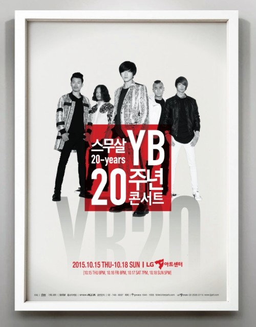 특히, 국내 공연장 중 독보적인 음향시설과 사석 없는 객석을 갖춘 최고의 공연장 LG아트센터에서 공연되는 것이어서 더 큰 의미를 가진다. YB의 음악을 가장 생생하게 최상의 사운드로 즐길 수 있을 것으로 기대된다.YB는 공식 페이스북을 통해 팬들과 소통하고 있으며, 데뷔 당시 모습을 비롯해 그 동안 공개된 적 없는 비하인드 영상과 사진을 최초로 선보이며고 다양한 이벤트를 진행 중이다.'YB 20주년 콘서트 스무살'은 서울 공연 이후 올해 연말까지 창원, 대구, 부산, 포항, 울산 등 9개 도시 전국 투어 일정을 이어간다.[YB, 사진=디컴퍼니]