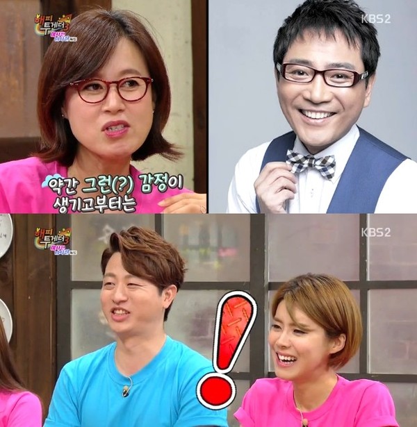 '해피투게더' 유상무와 장도연이 묘한기류를 풍겼다.6일 밤 방송된 KBS2 예능 프로그램 '해피투게더 시즌3'(이하 해피투게더)에서는 '여자사람친구'특집으로 꾸며졌다.이날 방송에서 유상무와 장도연에서 흐르는 '썸관계'에 대해 이야기 하던 중 박미선이 "유상무와 장도연 보니깐 나랑 남편 이봉원이랑 러브스토리랑 비슷해"라고 말했다.박미선은 "이봉원도 나랑 연애시절, 나한테 맛있는 거 사주고 싶어서 단체로 먹을 것을 사주곤 했다. 또 이봉원과 연애감정을 느낀 후 서먹서먹해지고 코너가 없어졌다"며 두 사람의 현재 모습이 자신이 결혼하게 된 스토리와 유사하다며 설명했다.또 박미선은 "사귈거면 비공개로 사겨라"며 진심어린 충고를 했다. 이에 유상무는 "지금 그러고 있다"며 너스레를 떨어 웃음을 자아냈다.한편 이날 '해피투게더'에는 김원준, 이아현, 유상무, 장도연, 강남 등이 출연했다.