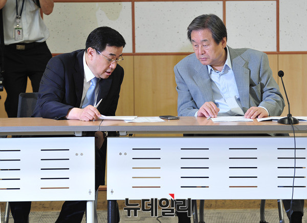 새누리당 김무성 대표가 김정훈 정책위 의장과 7일 오전 서울 여의도 국회 의원회관에서 열린 주요당직자회의에서 대화를 나누고 있다.