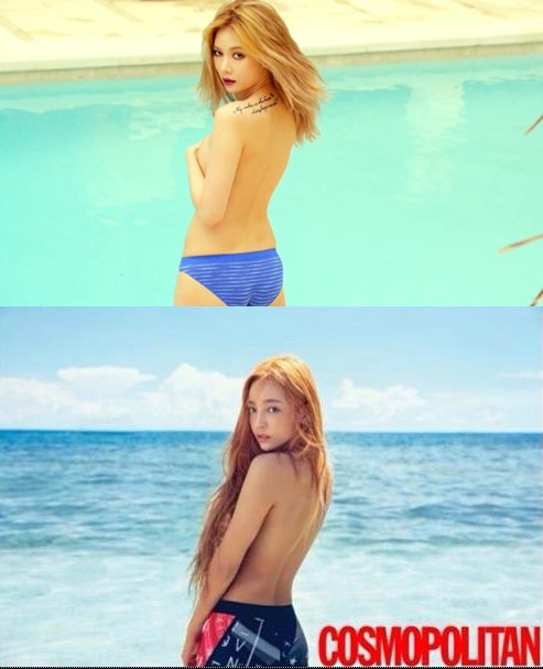그룹 포미닛의 멤버 현아가 8월 컴백 소식을 전했다. 현아는 10일 공개된 새 음반 '에이플러스'트레일러 영상을 공개, 영상 속 현아의 모습과 카라의 멤버 구하라와의 비슷한 포즈가 포착돼 네티즌들 사이에서 이목이 집중됐다.최근 한 온라인 커뮤니티에 '현아 구하라 같은 포즈'라는 제목으로 게시물이 올라왔다.게시물 속에는 등이 훤히 드러낸 채 현아와 구하라가 아찔한 뒤태를 뽐내고 있는 모습이 비교돼어 나란히 담겨있다. 특히 비교할 수 없는 각자의 섹시미를 발산하고 있어 시선을 사로잡았다.네티즌들은 "현아가 낫다 구하라보다 섹시는 현아인듯" "구하라가 더 섹시하다 청순섹시미 작렬""현아 구하라 둘다 몸매 장난아니다 대박"이라는 반응을 보였다.한편 현아는 오는 8월 중 네번째 솔로 미니음반 '에이플러스'를 발표하고 컴백활동에 돌입한다.