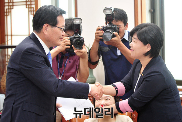 정의화 국회의장이 10일 오후 서울 여의도 국회 국회의장 접견실에서 새정치민주연합 여성의원들과 심학봉 의원 성폭행 의혹 관련 면담을 갖고 서영교 의원에게 성명서 자료를 받고 있다.