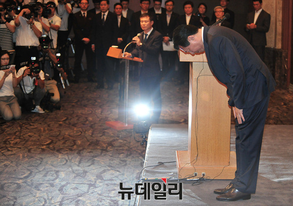 롯데그룹 신동빈 회장이 11일 오전 서울 중구 소공동 롯데호텔에서 형제간의 경영권분쟁과 관련해 고개를 숙여 대국민 사과를 하고 있다.