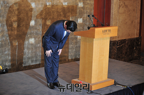 롯데그룹 신동빈 회장이 11일 오전 서울 중구 소공동 롯데호텔에서 형제간의 경영권분쟁과 관련해 고개를 숙여 대국민 사과를 하고 있다.