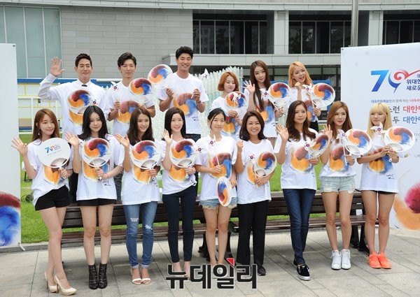 11일 오전 서울 종로구 대한민국역사박물관 앞 잔디광장에서 열린 광복 70주년 맞이 ‘대중 문화 예술인과 함께 하는 나라사랑 캠페인’에 참석한 인기 연예인 이태임, 스텔라, 남보라, 허이재 등이 참석해 포토타임을 진행했다.