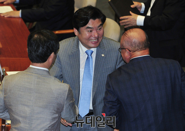 원유철 새누리당 원내대표가 11일 오후 열린 제336회국회(임시회) 제1차 본회의에서 동료 의원들과 대화를 나누고 있다.