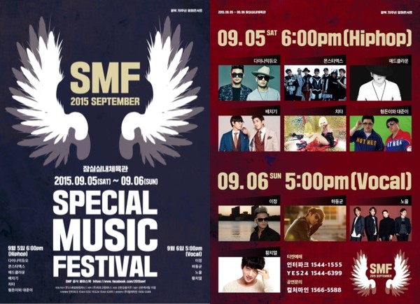 광복 70주년 기념 평화콘서트 'SMF(스페셜 뮤직 페스티벌)'의 2차 라인업이 공개됐다.오는 9월 5일, 6일 이틀간 잠실실내체육관에서 진행되는 'SMF'는 다이나믹듀오, 몬스타엑스, 매드클라운, 배치기, 치타, 이정, 하동균, 황치열 등 국내 최정상 힙합아티스트와 보컬리스트가 출연한다.이와 함께 SMF는 공식 페이스북을 통해 "2차 라인업에는 형돈이와 대준이, 노을이 확정됐다"라고 밝혔다.이에 주최 측은 "5일 형돈이와 대준이, 6일 노을이 추가되면서 음악 장르의 다양한 색을 연출하고 보다 풍부한 음악으로 관객들과 소통할 것"이라고 전했다.'SMF' 티켓은 인터파크, YES24를 통해 예매할 수 있다.[사진=컬처마인]
