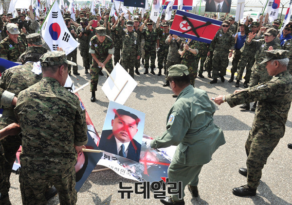 고엽제전우회 회원들이 13일 오전 경기도 파주시 통일대교 남단에서 [서부전선 비무장지대 지뢰 폭발 사건]에 대해 북한 김일성, 김정일, 김정은을 규탄하며 인공기와 초상화를 태우고 있다.