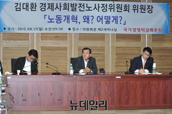 김대환 경제사회발전노사정위원회 위원장이 17일 오전 서울 여의도 국회 의원회관 세미나실에서 열린 [국가경쟁강화포럼 노동개혁 세미나]에서 노동시장 구조개혁을 주제로 강연을 하고 있다.
