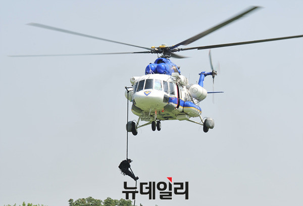 을지프리덤가디언(UFG) 훈련이 실시된 17일 오전 국회 상공에서 경찰특공대원들이 헬기 레펠 강하 훈련을 하고 있다.