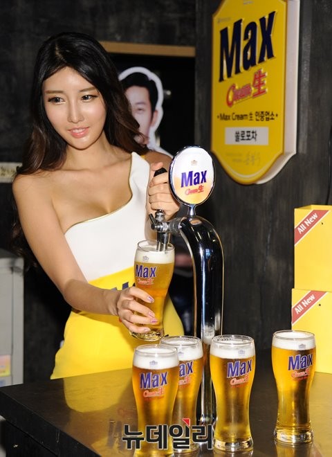 이날 크림탑걸로 변신한 레이싱모델 신세하가 맥주를 형상화한 의상을 입고 포즈를 취하고 있다.