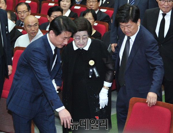 이희호 여사가 18일 오전 서울 동작구 국립서울현충원에서 열린 김대중 전 대통령 서거 6주기 추도식에 참석해 자리에 앉고 있다.