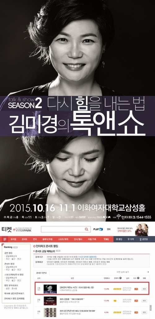'김미경의 톡앤쇼(Talk&Show) 시즌2–다시 힘을 내는 법'이 티켓 오픈과 동시에 콘서트 예매 1위로 올라섰다.국내 최초로 강연과 공연을 결합해 선보이는 토크콘서트 '김미경 톡앤쇼 시즌2'는 8월 25일 오후 2시 인터파크 예매처를 통해 판매가 개시됐으며, 티켓 예매가 시작되자마자 높은 예매율을 나타냈다.특히, 부동의 1위를 지켜오던 가수 김동률 콘서트를 제치고 콘서트 부문 예매 순위 1위(8/25 오후 7시 기준)를 기록하며 스타강사로서의 위엄을 입증했다. 지난 2014년 서울 공연 전석 매진을 기록한 것에 이어 올해까지 티켓 판매 1위를 기록하며 티켓 품귀 현상을 일으킬 것으로 예상된다.또한 전국 각지에서 그녀의 공연을 관람하고픈 팬들이 서울 공연 이후 진행될 전국 투어 일정까지 문의하며 폭발적인 관심을 보이고 있다. SNS상에는 그 동안 김미경 강사에게서 삶의 위로와 희망을 얻었던 수 많은 관객들의 응원 메시지와 티켓 구매 인증글이 이어졌다.이에 김미경은 "작년에 비해 조금 더 커진 규모로 진행되는 콘서트인 만큼 많은 분들이 찾아와주실까 걱정스런 마음도 있었는데, 이렇게 뜨거운 반응을 보내주셔서 감사하다"며 "보다 많은 분들의 삶에 힘이 되고자 열심히 준비했으니 땀으로 보답하겠다"고 감사의 마음을 전했다.'김미경의 톡앤쇼'는 김미경 강사가 관객들과 보다 가까운 거리에서 마음을 나눌 수 있는 교감의 장을 마련하고자 시작한 공연이다. 이번 시즌2 공연에서는 꿈을 잃고 방황하는 이들, 잔인한 현실 앞에 주저 앉은 이들에게 삶을 해석하는 현명한 해법을 전하는 '다시 힘을 내는 법'에 대해 이야기 한다.'김미경의 톡앤쇼–다시 힘을 내는 법'은 오는 10월 16일부터 11월 1일까지 총 17일간 이화여자대학교 삼성홀에서 공연된다.