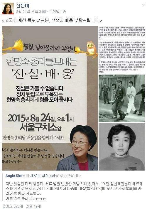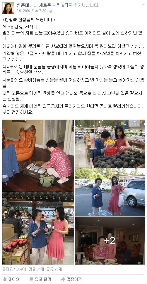 신은미는 "일전에 자신이 거주하는 미국 현지로 한 전 총리가 찾아와 함께 장을 보고 저녁을 먹었었다"며 "식사하시는 내내 눈물을 글썽이시며 세월호 아이들과 유가족 생각에 마음이 광화문에 있으셨던 선생님을 기억한다"고 전했다.