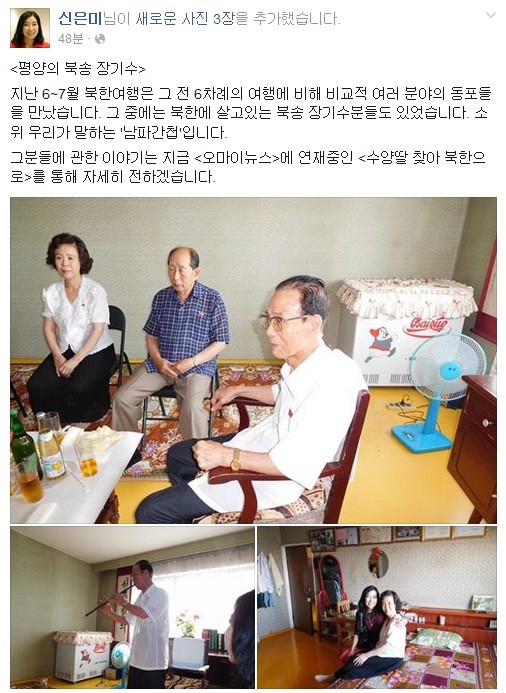 한편, 잇단 '종북 언행'으로 입국이 금지된 신은미는 지난 6월경 또 다시 북한을 방문, 현지에서 찍은 인증샷 다수를 페이스북에 공개하는 대담함을 보였다.
