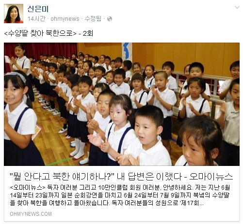 7월초까지 북한에 머물다 돌아온 신은미는 현재 자신의 방북 수기를 "수양딸 찾아 북한으로"라는 제목으로 인터넷매체 <오마이뉴스>에 연재 중이다. -