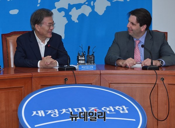문재인 새정치민주연합 대표가 26일 오후 국회 당대표실에서 마크 리퍼트(Mark Lipper) 주한 중국대사를 만나 남북관계 발전을 위한 미국 정부의 지지와 협력을 당부하는 시간을 가졌다. 앞서 문 대표는 추궈홍 주한 중국대사를 만나 대화했다.