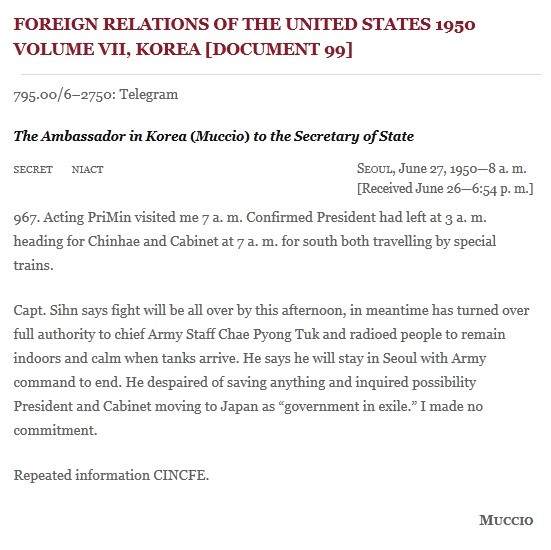 미 국무부 홈페이지에 따르면 무초 전 대사가 해당 전보를 국무부에 타전한 날짜는 1950년 6월 27일이었다. 결국 무초 전 대사가 전보를 친 날짜가 '이승만 정부의 6.27 망명 요청설'로 와전된 셈이다.