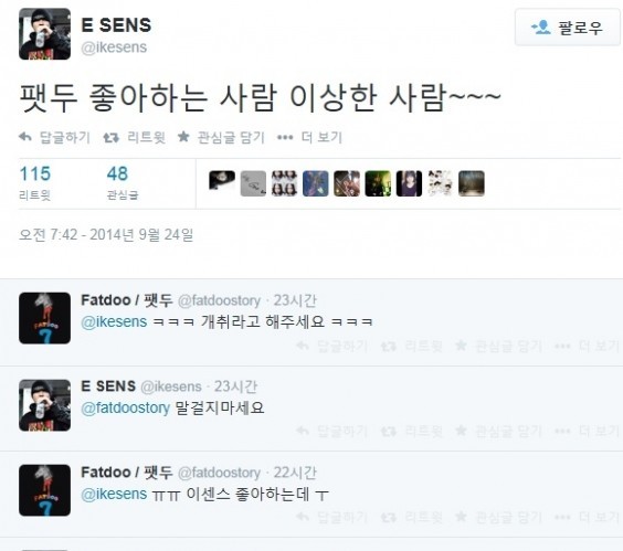 과거 래퍼 이센스는 자신의 SNS에 “방금 누가 유튜브로 팻두 아나콘다??? 들려줬는데 아 토할뻔", "나랑 팻두랑 동시에 좋아할거면 떠나시오 부탁이오”라는 글로 팻두를 디스했다.