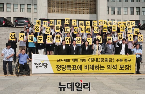 정의당 심상정 대표와 정진후 원내대표 등 당직자 등이 31일 오전 서울 여의도 국회 본청 앞에서 열린 [선거제도개혁촉구 결의대회]에서 정당득표율에 비례한 의석 배분을 촉구하고 있다