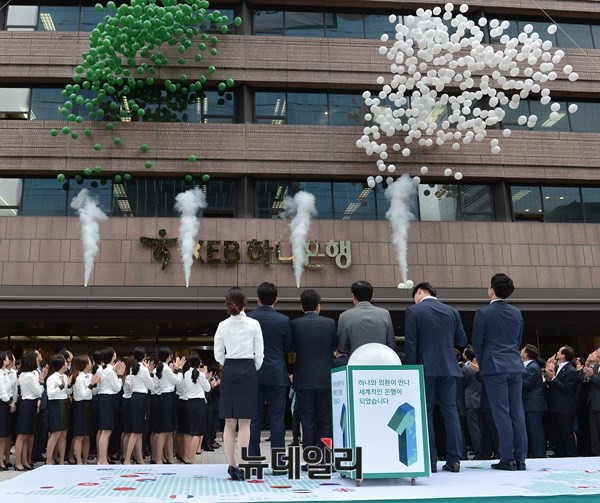 외환은행과 하나은행이 통합한 [KEB하나은행]이 1일 오전 서울 을지로 본사(옛 외환은행 본사)에서 현판식과 은행장 취임식을 가지고 새롭게 출발했다. 초대 KEB하나은행장은 함영주 행장이 맡게 됐다.