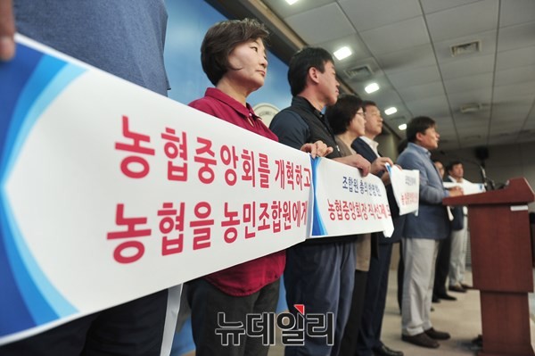• 농협중앙회장 직선제 도입을 위한 범국민서명운동 돌입 기자회견이 열린 1일 오전 서울 여의도 국회 정론관에서 좋은농협만들기 국민운동본부 관계자들이 농협 중앙회장 직선제 도입을 촉구하고 있다.