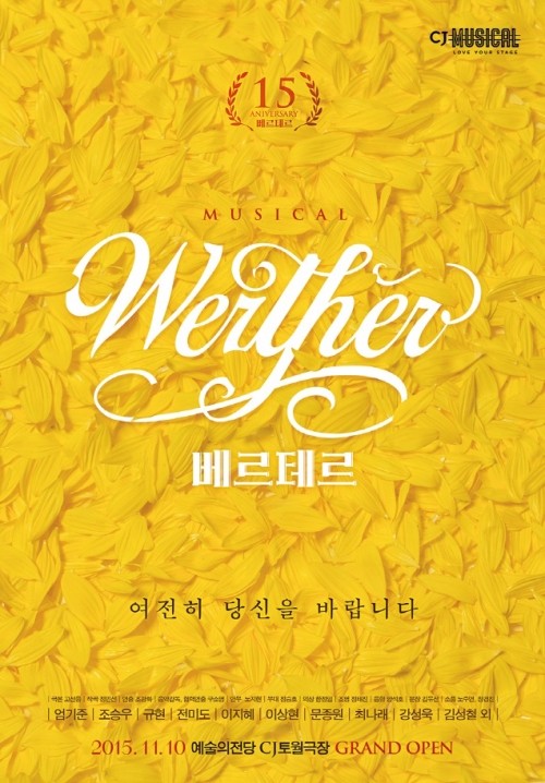 올해 창작 15주년을 맞는 뮤지컬 '베르테르'에 국내 최고의 배우들이 뭉친다.엄기준, 조승우, 규현이 뮤지컬 '베르테르' 15주년 출연을 확정하며 역대 최고의 캐스팅으로 기대감을 고조시키고 있는 것.섬세함과 폭발적인 감정 연기로 '베르테르' 그 자체로 불리는 엄기준, 2002년 순수하면서도 뜨거운 열정을 지닌 '베르테르'를 완벽하게 그려냈던 조승우, 그리고 가수는 물론 뮤지컬 배우로서 자리매김한 슈퍼주니어 규현이 '베르테르' 역을 맡아 각기 다른 매력을 발산한다.특히, 엄기준 조승우가 2002년 이후 13년 만에 '베르테르' 무대로 다시 만나 관객들의 관심을 불러모으고 있다. 2002년부터 올해까지 다섯 시즌에 걸쳐 '베르테르'를 맡은 엄기준은 완숙한 무대매너와 연기를 다시금 선보이고, 13년 만에 돌아온 조승우는 그간 '베르테르' 작품에 남다른 애정을 보였던 만큼 심도 깊은 내면 연기와 흡입력으로 레전드 무대를 보여줄 예정이다.또, 그간 뮤지컬 '삼총사', '그날들', '싱잉인더레인', '해를 품은 달', '로빈훗' 등 매 작품에서 뛰어난 캐릭터 소화력을 인정받은 규현이 '베르테르'를 통해 어떤 새로운 연기 변신을 보여줄 지 기대를 모은다.여기에 '베르테르'가 온 마음을 다해 사랑했던 여인 '롯데' 역에는 팔색조 매력의 전미도와 성숙한 연기를 자랑하는 이지혜가 다시 한 번 열연을 펼친다. '롯데'의 약혼자인 '알베르트' 역에는 중저음 보이스의 실력파 배우 이상현과 선 굵은 연기로 눈도장을 찍은 문종원이 캐스팅되었다.'베르테르'의 사랑을 진심으로 안타까워하는 펍 여주인 '오르카' 역은 존재감 있는 배우 최나래, 그리고 발하임의 낭만적인 정원사 '카인즈'는 주목받는 신예 강성욱, 김성철이 분한다.'베르테르'는 괴테의 '젊은 베르테르의 슬픔' 고전 원작을 무대로 옮긴 창작뮤지컬로 2000년 초연된 이래 총 9차례 재공연을 거듭, 25만명 관객을 동원하며 작품성과 흥행성을 인정받았다. 지난 15년간 뮤지컬에서는 이례적으로 실내악 오케스트라를 구성해 한층 더 풍성하고 서정적인 음악과 한 폭의 수채화 같은 무대로 진한 감동을 전해왔다.뿐만 아니라 2000년 초연 이후 서영주, 엄기준, 조승우, 임태경, 박건형, 송창의, 김다현 등 국내 내로라하는 최고의 배우들을 배출해냈으며, 2013년에는 도쿄 아카사카 ACT 씨어터에도 올라 글로벌 콘텐츠로서 가능성을 인정받기도 했다.뮤지컬 '베르테르'는 오는 11월 10일부터 2016년 1월 10일까지 예술의전당 CJ토월극장에서 공연된다.