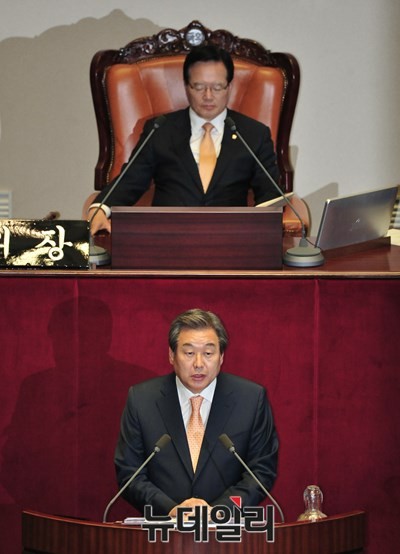 김무성 새누리당 대표가 2일 오전 서울 여의도 국회 본회의장에서 열린 제337회 국회 정기회 2차본회의에서 교섭단체 대표연설하고 있다.