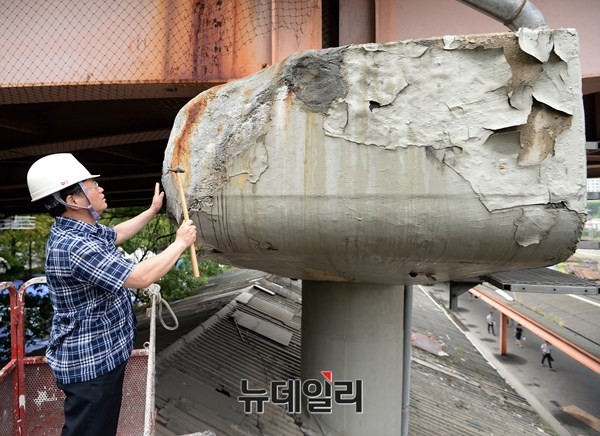 • 이채규 한국구조물안전연구원장이 2일 오후 서울역 고가차도 하부에서 고가차도에 발생한 구조적 균열을 기자들에게 설명했다. 이 원장은 이날 "서울역 고가차도에 구조적 균열이 발생해 붕괴할 우려가 있다"고 지적했다.