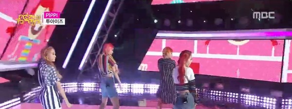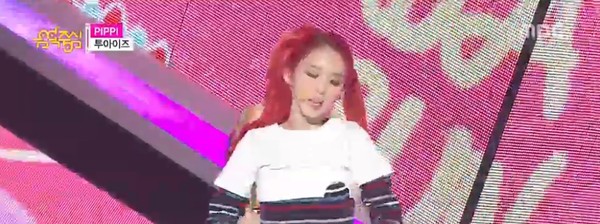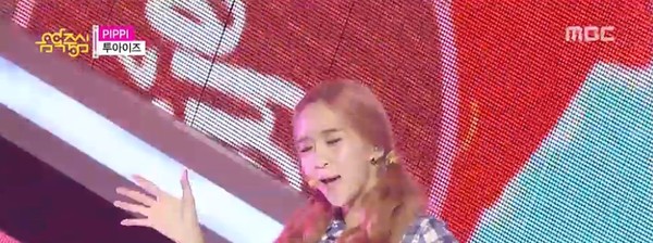'음악중심' 투아이즈가 동화속 소녀가 되어 나타났다.5일 오후 방송된 MBC '쇼 음악중심'에서는 걸그룹 투아이즈가 신곡 'PIPPI(삐삐)'로 상큼발랄한 무대를 선사했다.이날 투아이즈는 귀여운 삐삐 머리를 하고 톡톡튀는 안무와 뛰어난 가창력을 선사했다. 팬들은 후렴구에 맞춰 투아이즈의 노래를 신나게 따라불렀다.‘PIPPI’는 이단옆차기 사단의 long candy,우노, 라디오갤럭시가 작사, 작곡에 참여했으며 컨츄리 풍의 기타 리프와 중독성 있는 후렴구가 인상적인 댄스곡이다.한편,MBC '쇼 음악중심'에는 소녀시대 . B1A4 . 현아 . VIXX LR . 주니엘 . 여자친구 . 빅스타 . 소나무 . 스테파니 . 투아이즈 . 비트윈 . 에이프릴 . 딘딘 . 아미 . 전설 . 놉케이 . 퍼펄즈 . 연분홍 . 이주선 . 유니콘 등이 출연했다