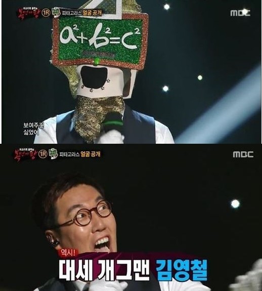 ‘복면가왕’의 ‘피타고라스의 정리’의 정체가 개그맨 김영철로 밝혀져 관심이 집중됐다.6일 방송된 MBC ‘일밤-복면가왕’에서는 ‘네가 가라 하와이’에 맞설 8명의 새로운 복면가수가 등장해 듀엣대결을 펼쳤다.이날 1라운드 2조로는 ‘상남자 터프가이’와 ‘피타고라스의 정리’가 조성모의 ‘너의 곁으로’로 무대를 꾸몄다. 투표결과 '상남자 터프가이'가 승리했다.‘피타고라스의 정리’는 노래를 부르는 순간부터 정체를 의심받았다. 이에 패널들은 확신을 가지고 인터뷰 때 ‘피타고라스의 정리’를 몰아가자 당황한 ‘피타고라스의 정리’는 변조마이크를 떼고 말을 하는 등 해탈한 모습을 보여 폭소케 했다.이에 '피타고라스의 정리'는 ‘입영열차 안에서’를 열창한 후 가면을 벗었고 그의 정체는 역시나 김영철이었다. 정체가 밝혀진 후 김영철은 보아의 흉내를 내는 등 대세 개그맨의 예능감 넘치는 모습을 선보여 웃음을 자아냈다.
