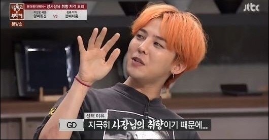 '냉장고를 부탁해' 지드래곤이 셰프 김풍을 선택한 이유를 밝혔다.7일 방송된 JTBC '냉장고를 부탁해'에서는 빅뱅 멤버 태양과 지드래곤 편 2탄으로 꾸며졌다.이날 지드래곤은 첫 번째 요리 미션으로 '양 사장님 취향 저격요리'를 부탁했고, 이에 김풍 작가와 이찬오 셰프의 대결이 펼쳐졌다.이찬오 셰프는 전복, 송로버섯, 장어흑마늘즙, 삼겹살 등의 재료를 이용한 '양싸퀴진'을 선보였고, 김풍은 메밀라면을 이용한 분짜지용으로 맞섰다.예상 밖에 지드래곤은 김풍을 선택한 뒤, "지극히 사장님의 취향이다. 사장님이 또 가정도 있고 조금 이렇게 요즘 많이 못 논다. 야한 것도 못 보신다. 예전의 기억으로 돌아가셔 그런 맛을 찾을 거 같다"고 이유를 밝혀 폭소케 했다.한편 이를 접한 네티즌들은 "'냉장고를 부탁해' 지드래곤 선택이유 웃기네" "'냉장고를 부탁해' 지드래곤 설명한 것 웃기네" "'냉장고를 부탁해' 지드래곤 김풍선택했구나"라는 반응을 보였다.