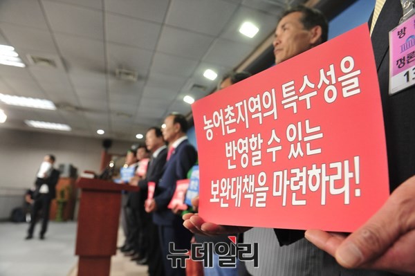 새누리당 이한성 의원을 및 농어촌 지역구의원들이 7일 오전 서울 여의도 국회 정론관에서 농어촌 선거구가 줄어들 것으로 예상되자 지역의 대표성과 특수성 반영이 이뤄지지 않고 있다며 기자회견을 갖고 있다.