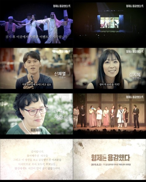 지난 8월 29일 토요일 저녁공연이 끝난 후 뮤지컬 '형제는 용감했다'에서는 특별한 이벤트를 열었다. '형제는 용감했다'에 출연 중인 배우들의 부모님이 자식들에게 전하고 싶은 메시지를 영상으로 담아 공연이 끝난 후 배우와 관객들이 함께 감상하도록 준비한 것.