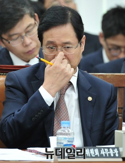 김용희 중앙선거관리위원회 사무총장 11일 오전 서울 여의도 국회에서 열린 안전행정위원회 중앙선거관리위원회 등에 대한 국정감사에서 얼굴을 만지고 있다.