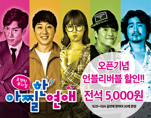 오는 25일 개막을 앞둔 뮤지컬 '아찔한 연애'가 파격 할인을 진행한다.뮤지컬 '아찔한 연애'는 문화체육관광부 공연티켓 1+1 지원사업 참가작에 선정돼 15,000원으로 2장을 구매할 수 있다. 여기에 개막일부터 10월 4일까지 오픈기념 할인행사가 진행돼 5,000원이라는 파격가로 구매 가능하다.'아찔한 연애'는 로맨틱 코미디 창작 뮤지컬로 서른 살의 아마추어 작가 지망생 '나현실'이 어릴적 동네 친구인 계약직 '경만'의 집에 얹혀 살며 자신의 운명적인 사랑과 꿈을 꾸는 이야기다.그 속에서 '나현실'은 성격과 스타일이 다른 세 명의 남자를 만나며 진정한 사랑의 상대를 찾으려 한다. 특히, 예상치 못한 상황들을 통해 진짜 현실의 벽에 부딪히는 모습을 보여주며 공연을 관람하는 이들에게 찰진 웃음과 진한 공감을 선사한다.로맨틱 코미디 특유의 달달함으로 '88만원 세대'의 공감을 불러일으키는 뮤지컬 '아찔한 연애'는 9월 25일부터 압구정 윤당아트홀에서 만나볼 수 있다.