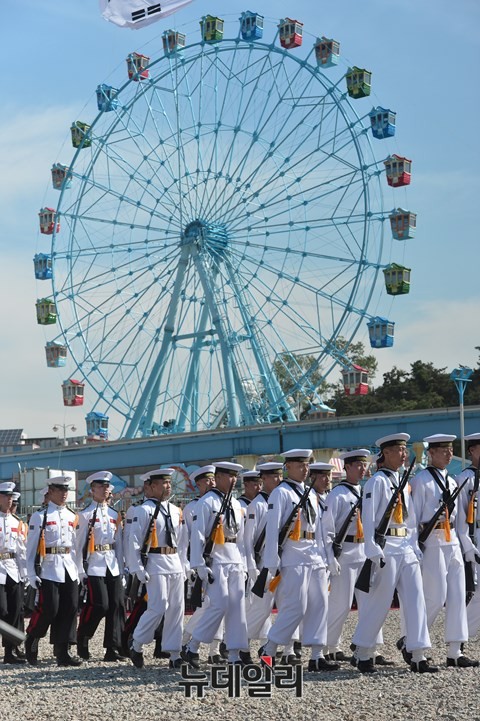 [제65주년 인천상륙작전 전승행사 기념식]이 15일 오전 인천 월미도 행사장에서 진행됐다.이날 전승행사에는 정호섭 해군참모총장과 참전용사 대표, 유정복 인천광역시장, 한기호 새누리당 의원, 함명수 제 7대 해군참모총장 등 관계자들과 시민들이 참석했다.인천상륙작전 재연 행사는 해군 5전단장이 지휘하는 상륙기동부대가 인천 상륙작전 시 최초 상륙지점의 역사적 의미를 가진 월미도를 대상으로 진행했다. 상륙작전 재연에는 韓·美 해군 함정 및 한국 육·해·공군 및 해병대가 참가해 현대화된 우리 국군의 연합·합동 상륙작전 능력을 과시했다.(인천=뉴데일리 정상윤 기자)