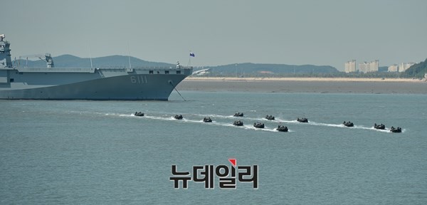 [제65주년 인천상륙작전 전승행사 기념식]이 15일 오전 인천 월미도 행사장에서 진행됐다.이날 전승행사에는 정호섭 해군참모총장과 참전용사 대표, 유정복 인천광역시장, 한기호 새누리당 의원, 함명수 제 7대 해군참모총장 등 관계자들과 시민들이 참석했다.인천상륙작전 재연 행사는 해군 5전단장이 지휘하는 상륙기동부대가 인천 상륙작전 시 최초 상륙지점의 역사적 의미를 가진 월미도를 대상으로 진행했다. 상륙작전 재연에는 韓·美 해군 함정 및 한국 육·해·공군 및 해병대가 참가해 현대화된 우리 국군의 연합·합동 상륙작전 능력을 과시했다.(인천=뉴데일리 정상윤 기자)