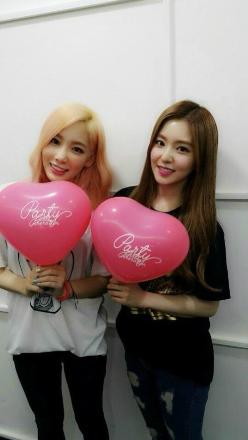 공개된 사진 속 태연과 아이린은 하트 모양 풍선을 든 채 나란히 서서 카메라를 응시하며 닮은꼴 미모를 과시하고 있다.