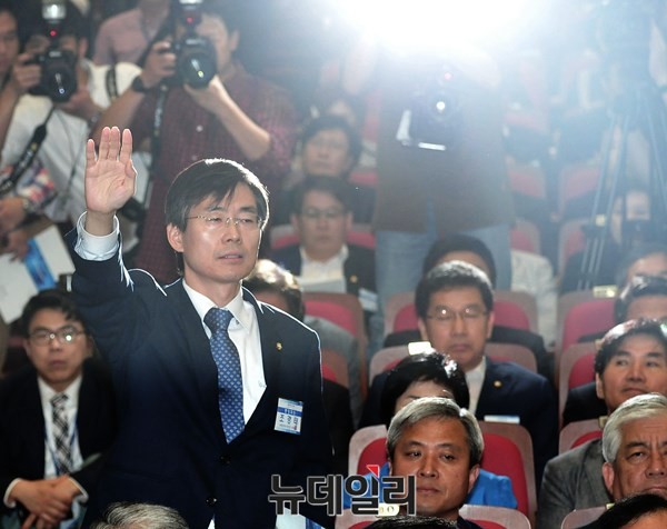 조경태 새정치민주연합 의원이 16일 오후 서울 여의도 국회 의원회관에서 열린 제2차 중앙위원회의에서 회의를 언론에 공개하라고 건의를 하고 있다.